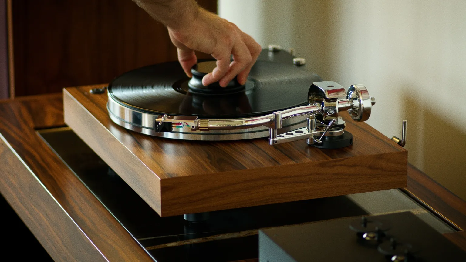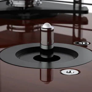 The heavyweight platter spins on an inverted ceramic ball bearing with a magnetic support to reduce bearing noise and resonance to an absolute minimum.