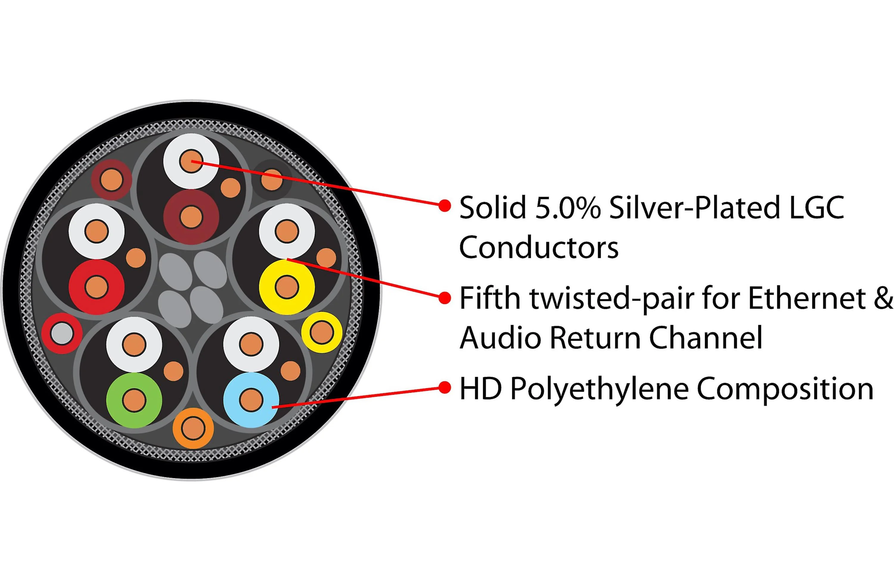 Solid conductors eliminate strand-interaction distortion and reduce jitter. Solid silver-plated conductors are excellent for very high-frequency applications, like HDMI audio and video. These signals, being such a high frequency, travel almost exclusively on the surface of the conductor. As the surface is made of high-purity silver, the performance is very close to that of a solid silver cable, but priced much closer to solid copper cable. This is an incredibly cost effective way of manufacturing very high-quality HDMI cables.