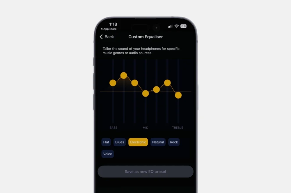 We’ve tuned P100 to deliver precise highs and dynamic lows, but we get that you might want to do your own thing. Customise your listening with Melomania Connect. Create your own presets or choose from six expertly curated profiles.