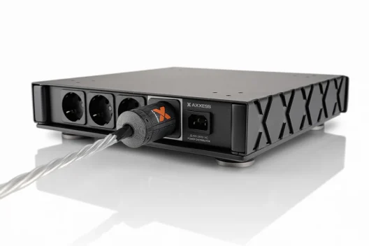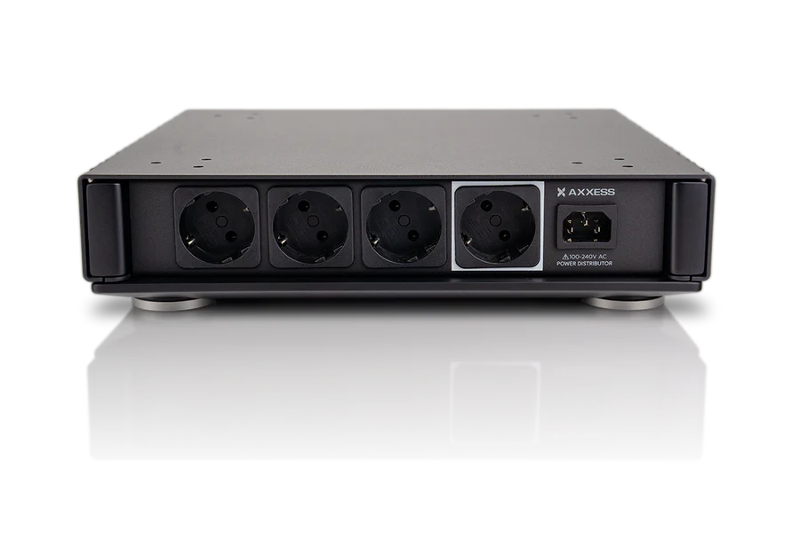 The Axxess Power Distributor features a milled natural-based composite interior and an external lacquered steel frame. This combination of materials optimally balances rigidity and vibration control. The steel frame resists mechanical vibrations and magnetic interference, while the composite interior grounds unwanted oscillations, enhancing musical performance and providing a more immersive listening experience.