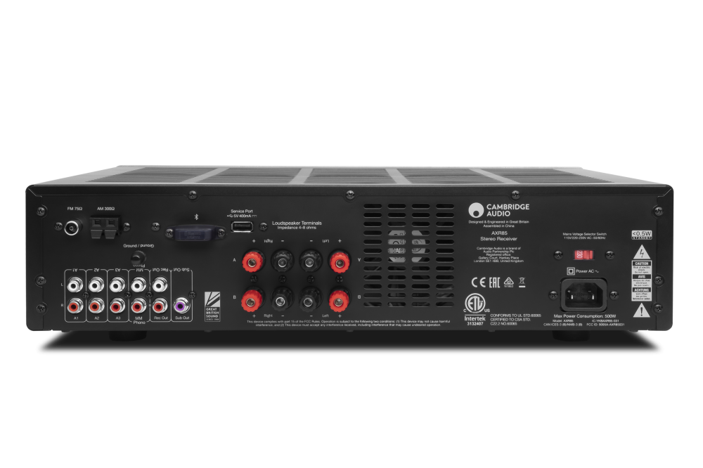 AXR85 is a well-connected receiver, with 3 pairs of analogue RCA inputs, moving magnet phono section for a turntable and a pair of recording outputs. Hi-fi quality speaker binding posts (connectors), for 2 sets of speakers, mean that thick cable connects securely for an authentic sound. There’s even an output for a subwoofer.