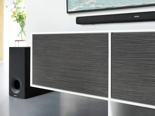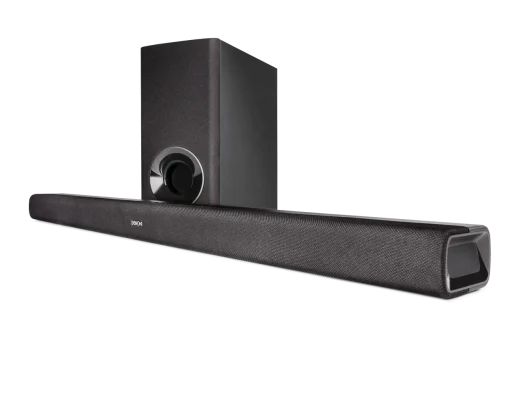 Denon DHT-S316 2.1-Channel Soundbar System. The soundbar features a stereo design with a wireless subwoofer for enhanced bass. You can connect your display via HDMI ARC or optical, and an 1/8″ jack allows you to connect other sources. Dolby Digital and DTS decoding, along with onboard technologies, help provide a virtual surround sound experience.