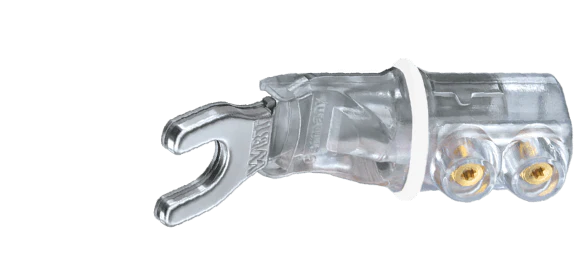 5/16″ / 8.1mm sandwich spade connector. Pure Fine Silver contact is direct Platinum plated to protect against tarnish and oxidation. High current spade lug with elastomeric shock absorber for progressive contact pressure eliminating structure born and air born noise as well as magnetostriction. Fully insulated body is safe to use and conforms to international safety standards. Warning against usage of contact cleaners: their contents may cause damage to polycarbonate insulators.