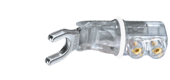1/4″ / 6.4mm sandwich spade connector. Pure Fine Silver contact is direct Platinum plated to protect against tarnish and oxidation. High current spade lug with elastomeric shock absorber for progressive contact pressure eliminating structure born and air born noise as well as magnetostriction. Fully insulated body is safe to use and conforms to international safety standards. Warning against usage of contact cleaners: their contents may cause damage to polycarbonate insulators.
