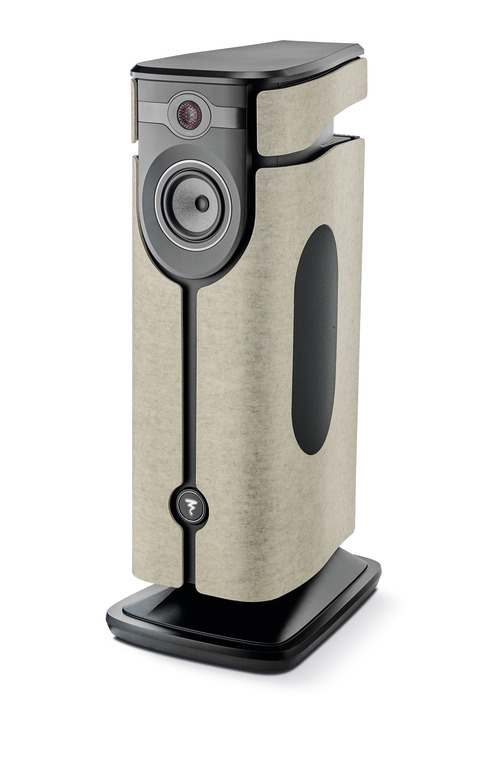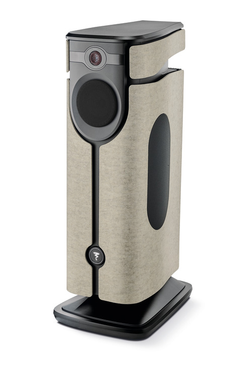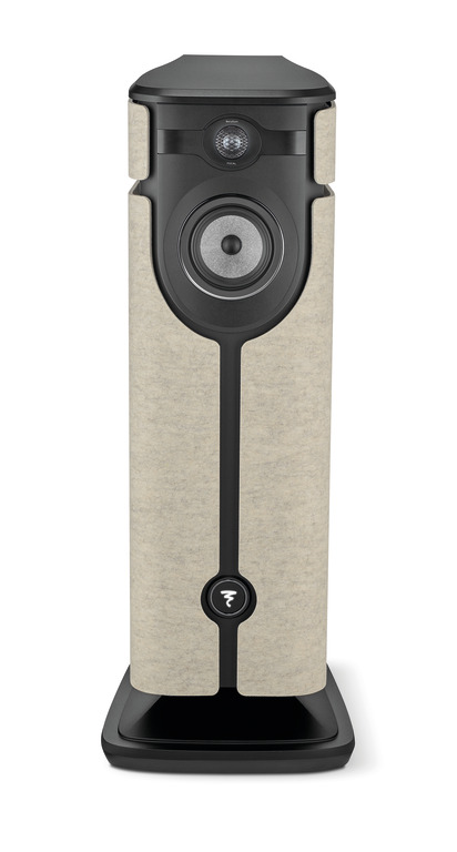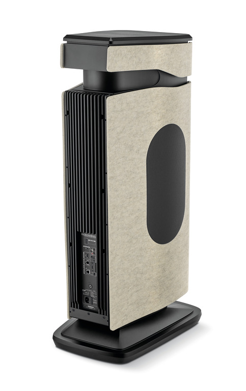 Mezza Utopia blends a streamlined silhouette with distinctive design elements, such as the brushed aluminum band surrounding the tweeter—forming the “signature watch,” a symbol of Utopia excellence—and the curved rear heatsink. The side panels, made of ivory-colored felt, illuminate the speaker and its environment.